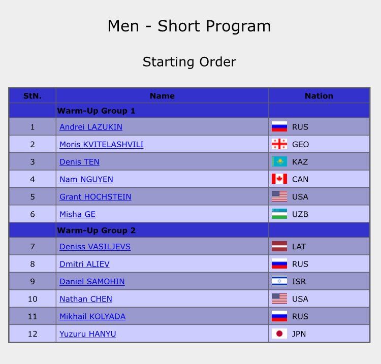Domani mattina, con inizio alle h 8.30 (7.30 italiane), si terrà la seconda sessione di Practice ufficiale, nella quale i pattinatori proveranno il programma corto. Per questa practice l’ordine in cui gli atleti eseguiranno il proprio run through sarà lo stesso della gara, quindi Yuzuru sarà l’ultimo.